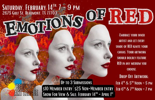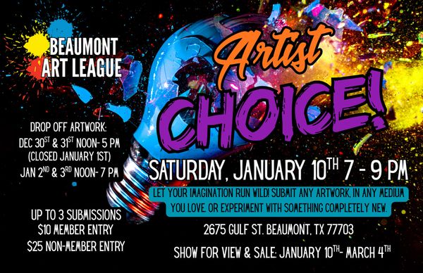 1st, 2nd, 3rd, and honorable mention winners from each monthly exhibition at the Beaumont Art League will have the opportunity to show their artwork at the Southeast Texas Stages.